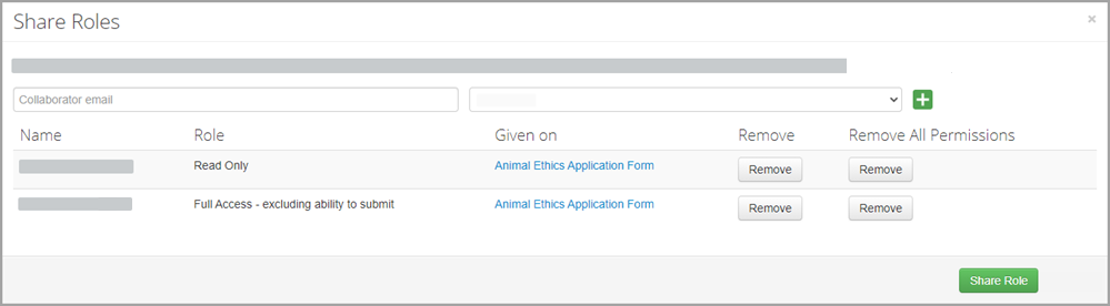 - Click Remove to remove a specific role that has been assigned to a collaborator, or, if the collaborator has multiple roles and is therefore listed multiple times, you can click Remove All Permissions for this person. If a collaborator is listed multiple times, the role with the highest level of access will apply.